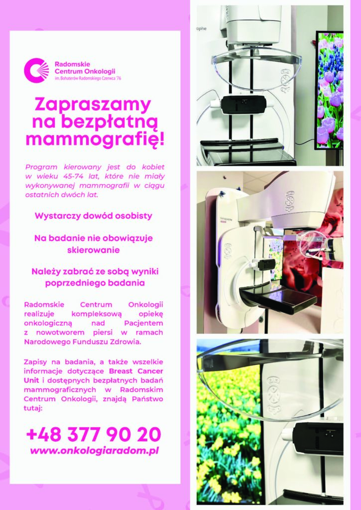 Jeśli masz 45-74 lata i w ciągu ostatnich dwóch lat nie miałaś wykonywanej mammografii to mamy dla Ciebie ważną informację- Od miesiąca października zaczynamy współpracę z Radomskim Centrum Onkologii(RCO) w ramach której będziemy wykonywać badania mammograficzne.